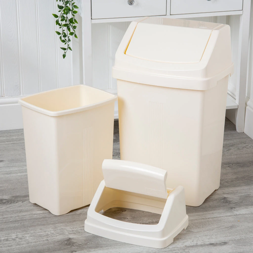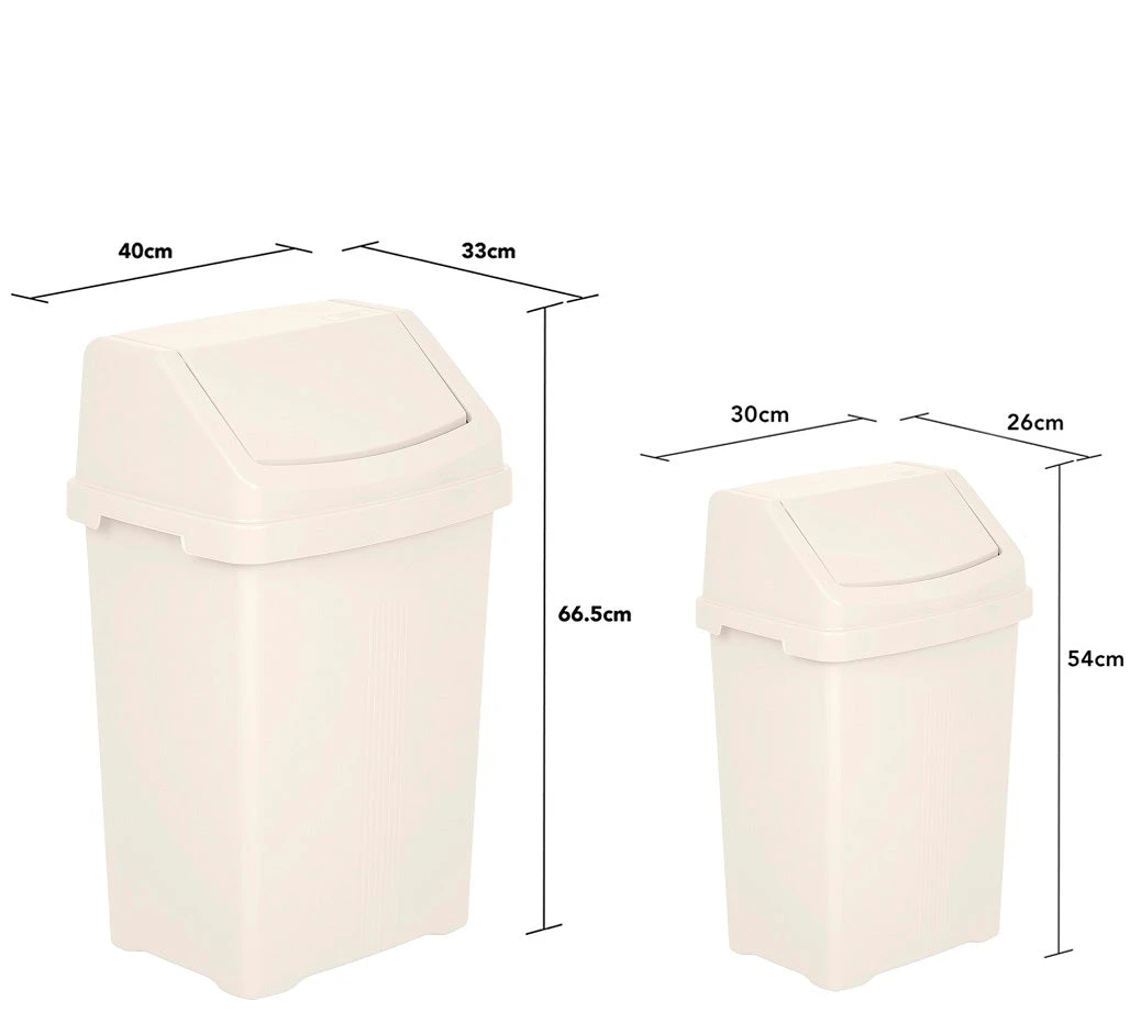 Bin with swing style lid. Made from lightweight, yet durable and easy to clean plastic.