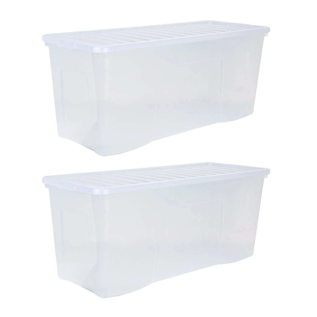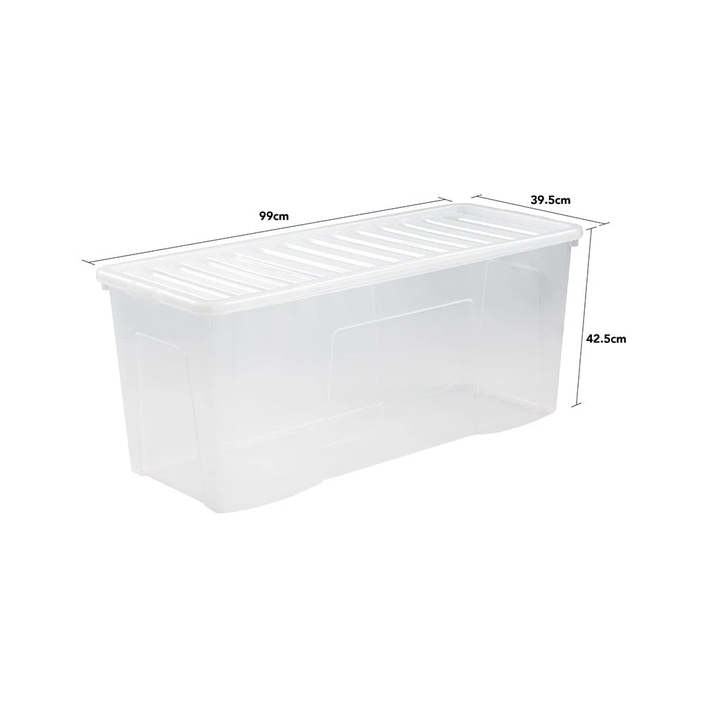High quality 133 litre storage box with clip on lid. Versatile storage suitable for all around the home and workplace. Ideal size for storing your Christmas tree and decorations. Dimensions: 99.00 x 39.50 x 42.50 cm