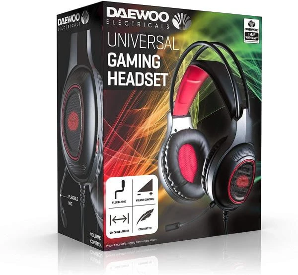Daewoo Universal Gaming Headset with Flexible Microphone and Smooth Scroll Volume Control, Wired Input Suitable for All 3.5mm Interface Devices, Extra Long 2m Cable and Faux Leather Ear Cushions