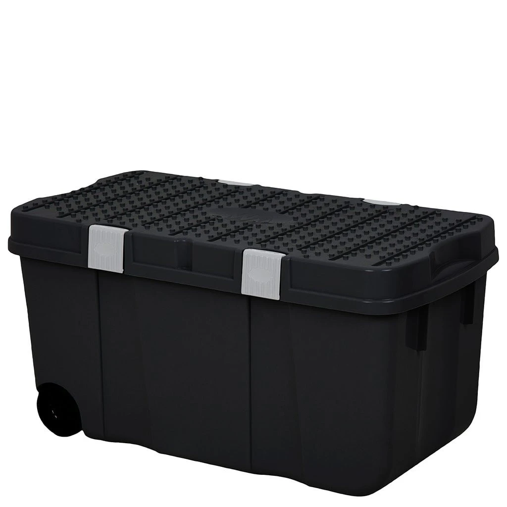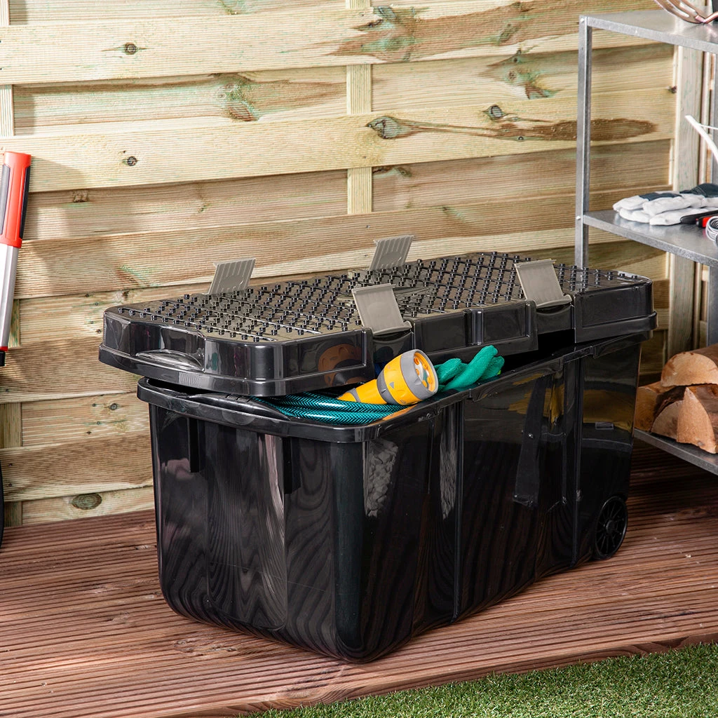 Massive 100 litre storage cart with wheels and removable lid. Award winning design means it’s stable when in the rested position and you simply ‘tip and pull’ to move. Axled wheels are rubber coated for extra grip and strength.