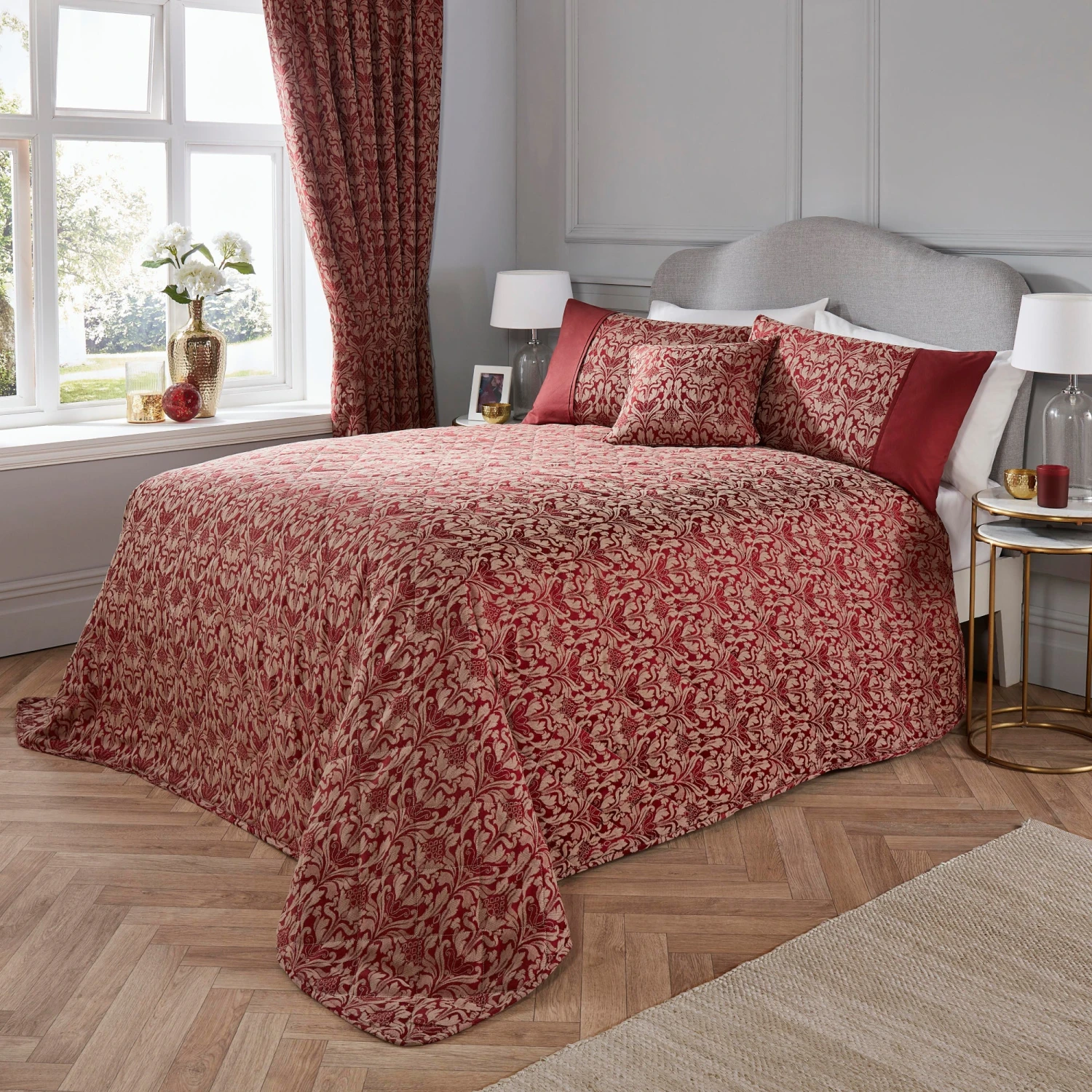 Woven on a cotton rich fabric and featuring a stunning hand drawn damask pattern, this plain dyed jacquard, quilted bedspread will look great in any classic bedroom.