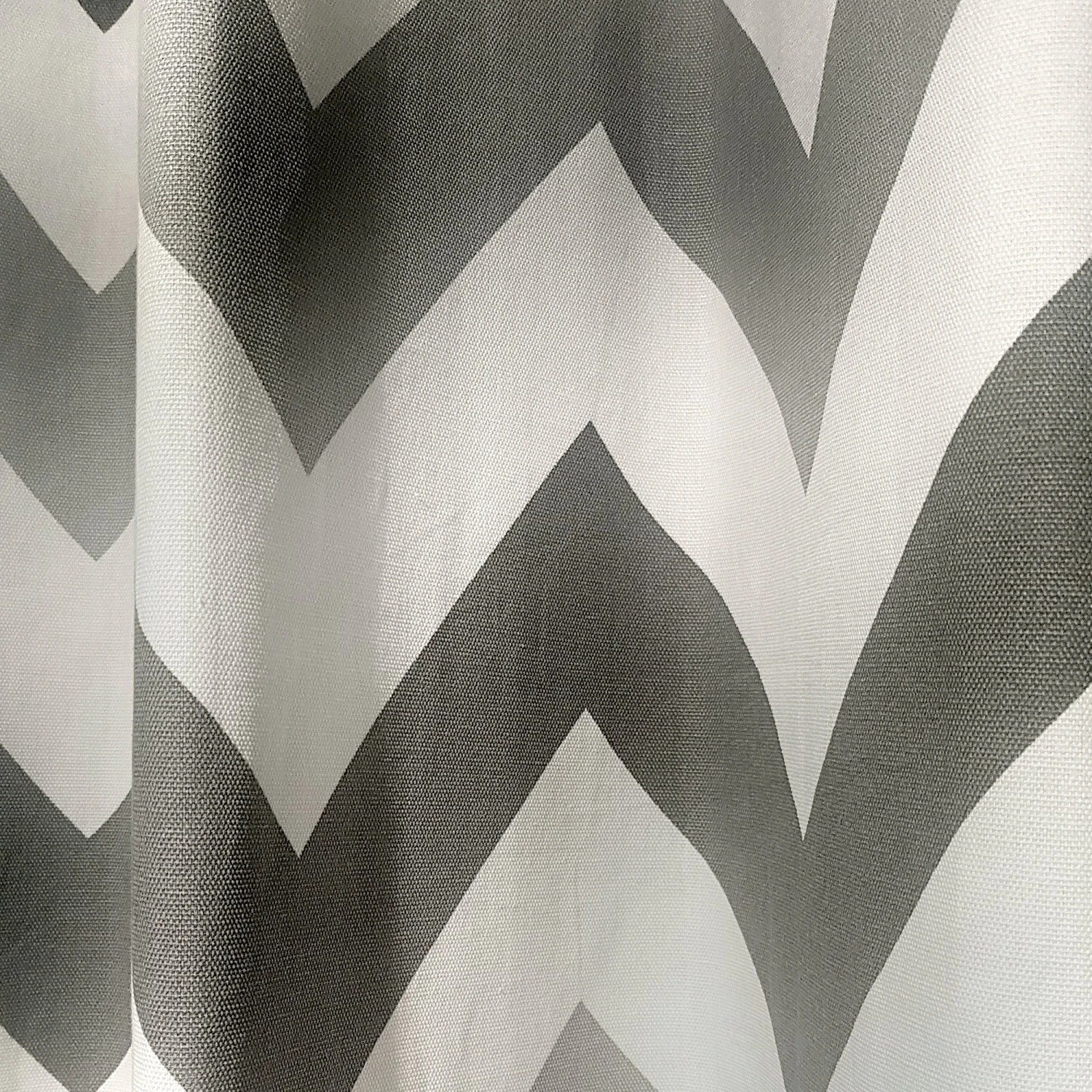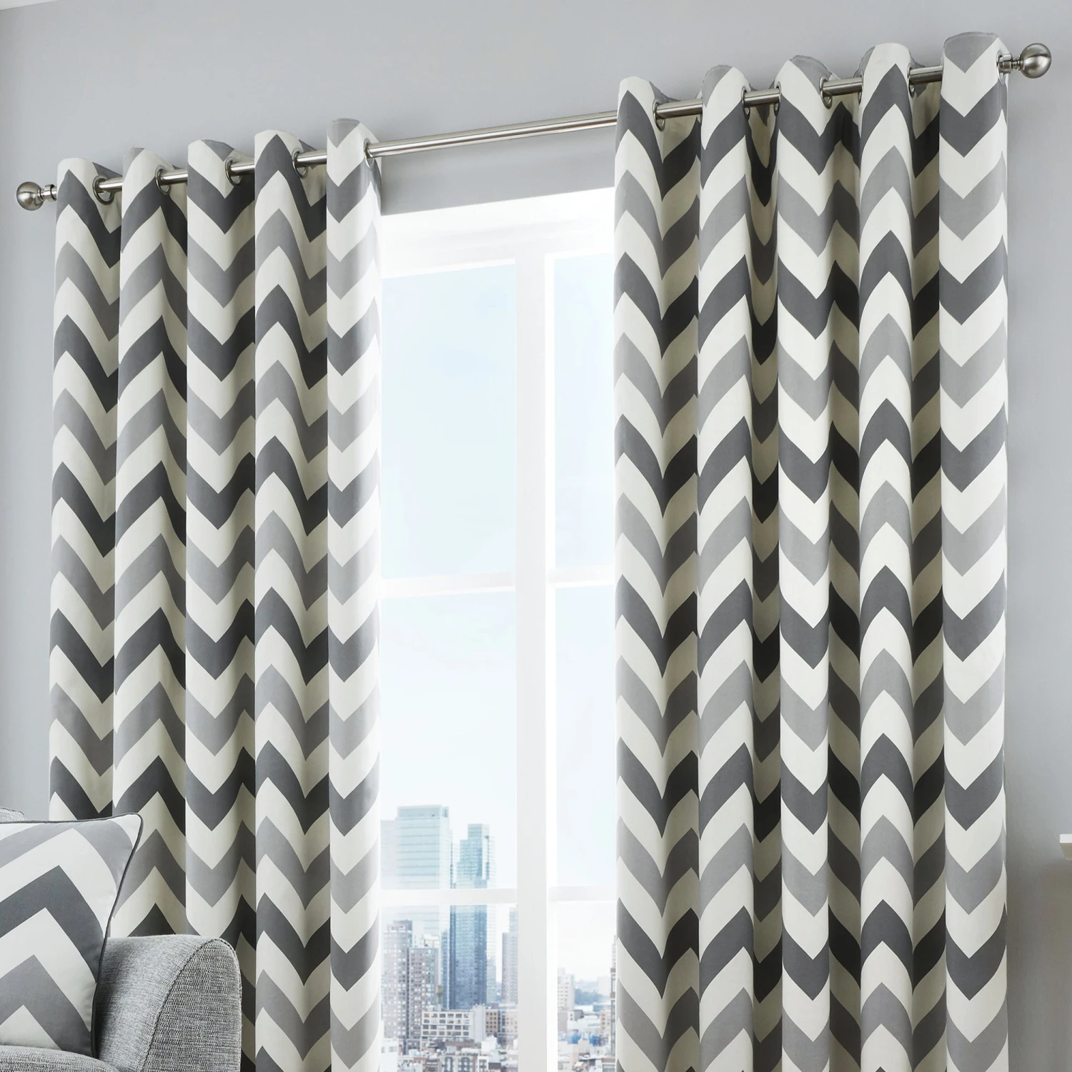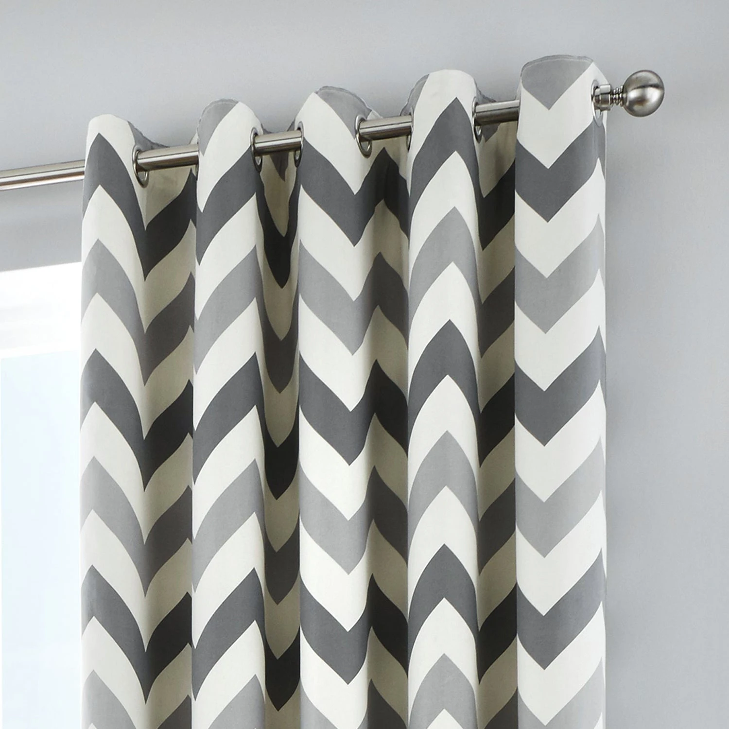 The Chevron range from Fusion features a simple printed grey and white zig-zag design pattern. These ready-made eyelet / ring curtains are made with quality 100% cotton face and are fully-lined with a light-filtering fabric.
