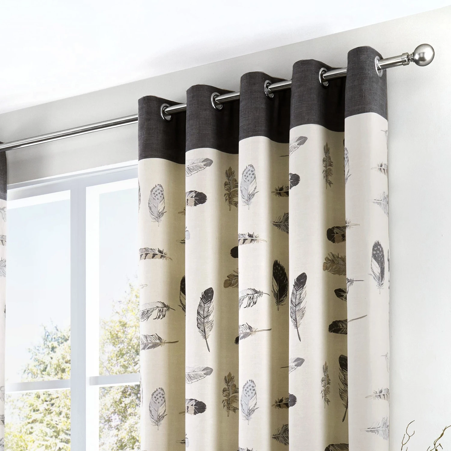 Stunning feather motifs on off-white fabric make these curtains a bang on trend design for the stylish modern home. Features a 25cm dark grey contrasting border heading frame.