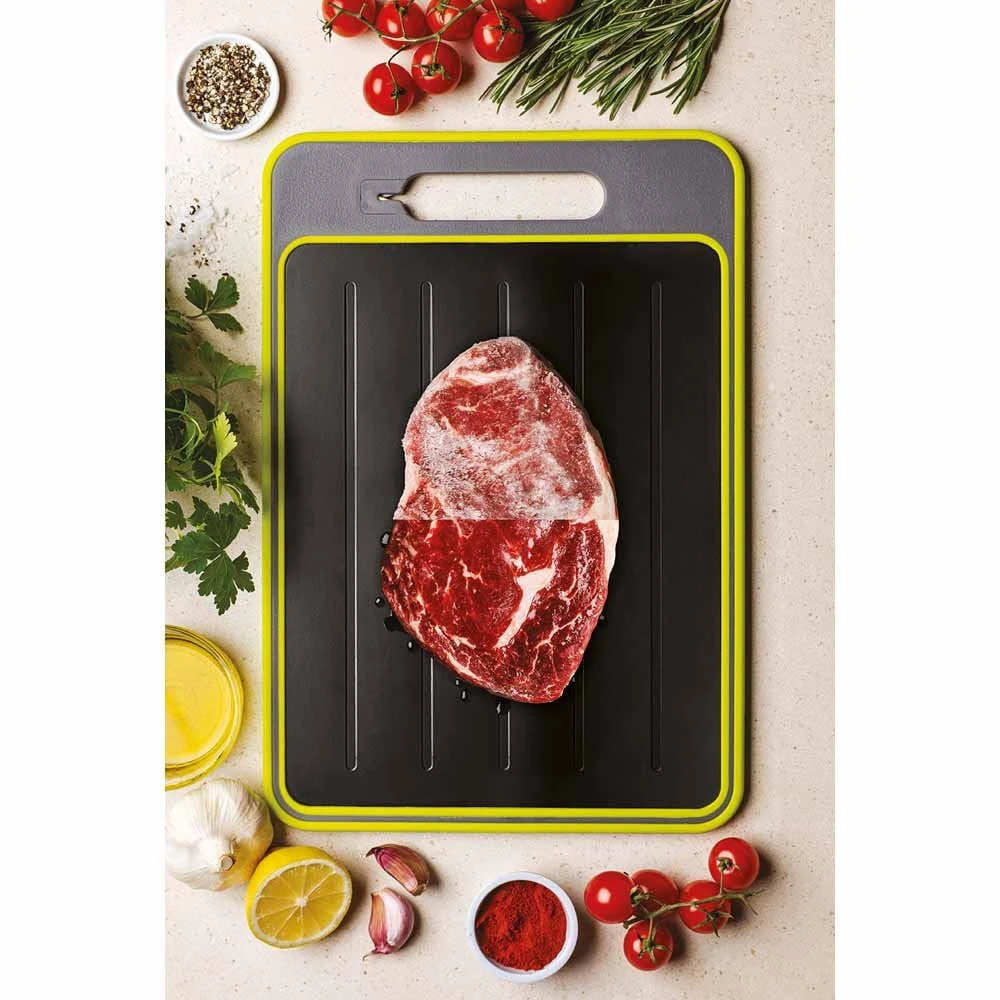 Thaw your food three times faster with Fast Thaw 4-in-1 Chopping Board. Thawing food takes time and defrosting in a microwave can leave your food tasting like rubber. Fast Thaw’s natural thermal conductivity quickly draws out the cold from your food, defrosting your food faster. It is far more than just de-frosting food – flip it over and it’s a handy, easy-clean chopping board. With a non-slip rubber edge, it stays safely in place on your worktop. The built-in knife honer keeps your knives sharper for longer while you’re chopping! There’s even an integrated grinder that’s perfect for grinding down herbs and spices! And when you’re finished, simply place Fast Thaw in the dishwasher. Fast Thaw is the perfect 4-in-1 kitchen board for chopping, thawing, honing and grinding. All in one, amazing board!