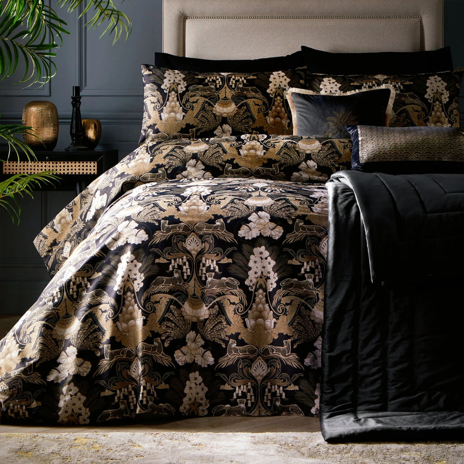Enjoy heady jungle nights beneath this indulgent bedding set – a richly designed riot of exotic foliage and beautiful big cat detailing. Printed on pure cotton and featuring a plain reverse for a mood-switching contrast, this is a visual echo of a bygone age.