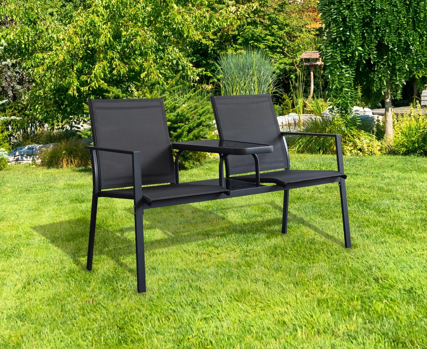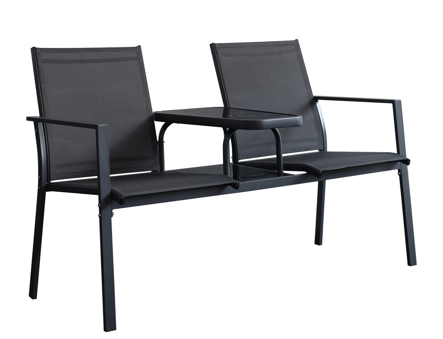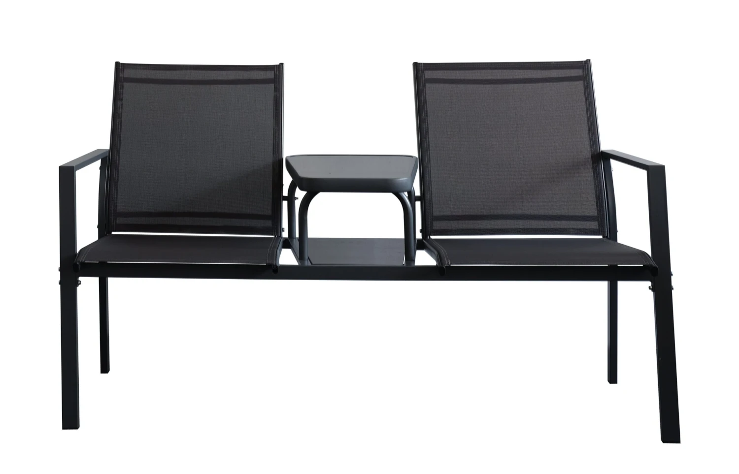 Stylish and contemporary love seat with middle table. Made from steel and textilene fabric for durability.
