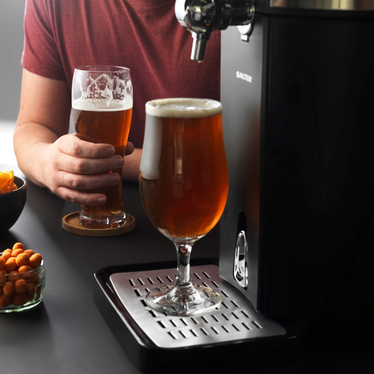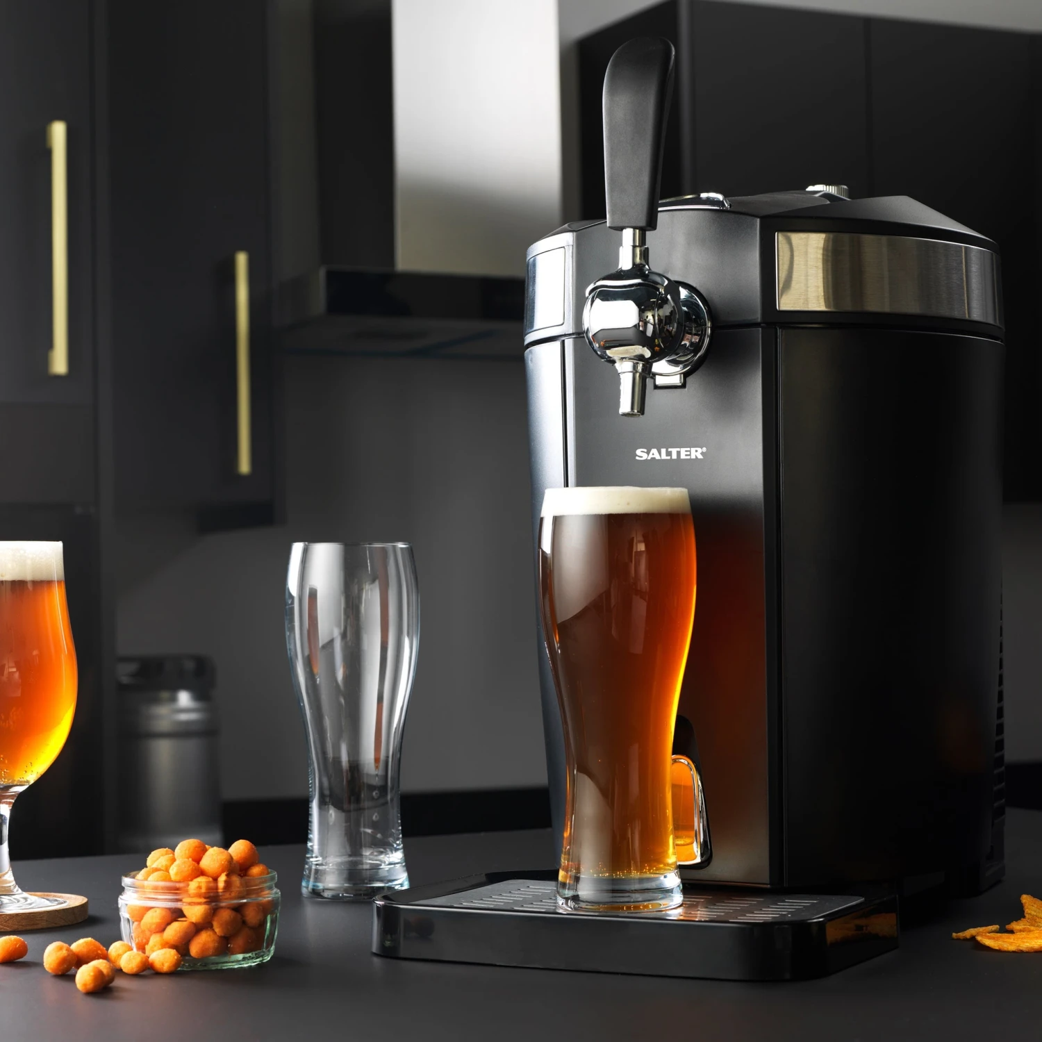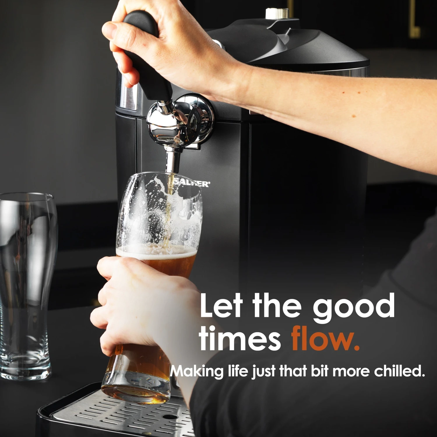 Enjoy ice-cold beer and experience the pub at home with this Salter Professional chilled draught beer dispenser. This all-in-one universal beer tap is compatible with both pre and non-carbonated 5L kegs for brewery quality beer in seconds. For non-carbonated kegs simply use the CO2 attachment and included cartridges to bring the bar home. Complete with a removable drip try and an integrated cooling system, this freestanding dispenser has a sleek design to compliment any kitchen table or worktop.
