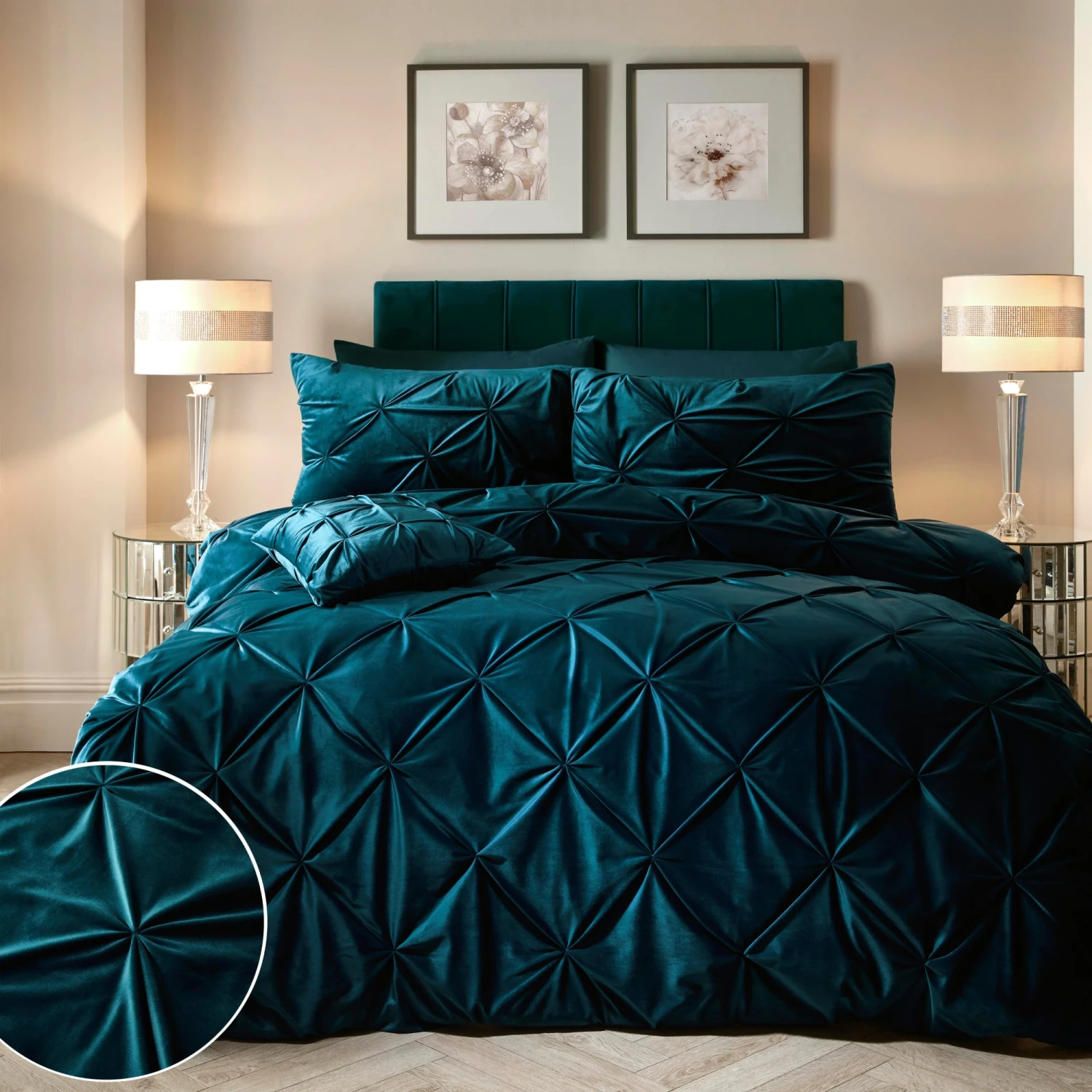 Sumptuously soft velvet dyed in this season’s must have colour pallete is then pinch pleated to create this stunning new duvet cover set that will enhance any modern boudoir.