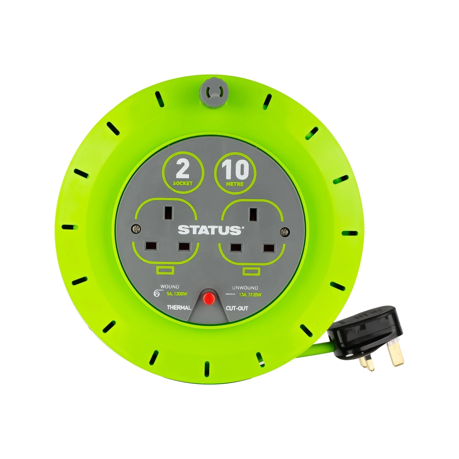 10 Mtr – 13 amp – 2 Socket Outlet with Thermal Cut Out – Green – Status – Cassette Reel – 1 pk