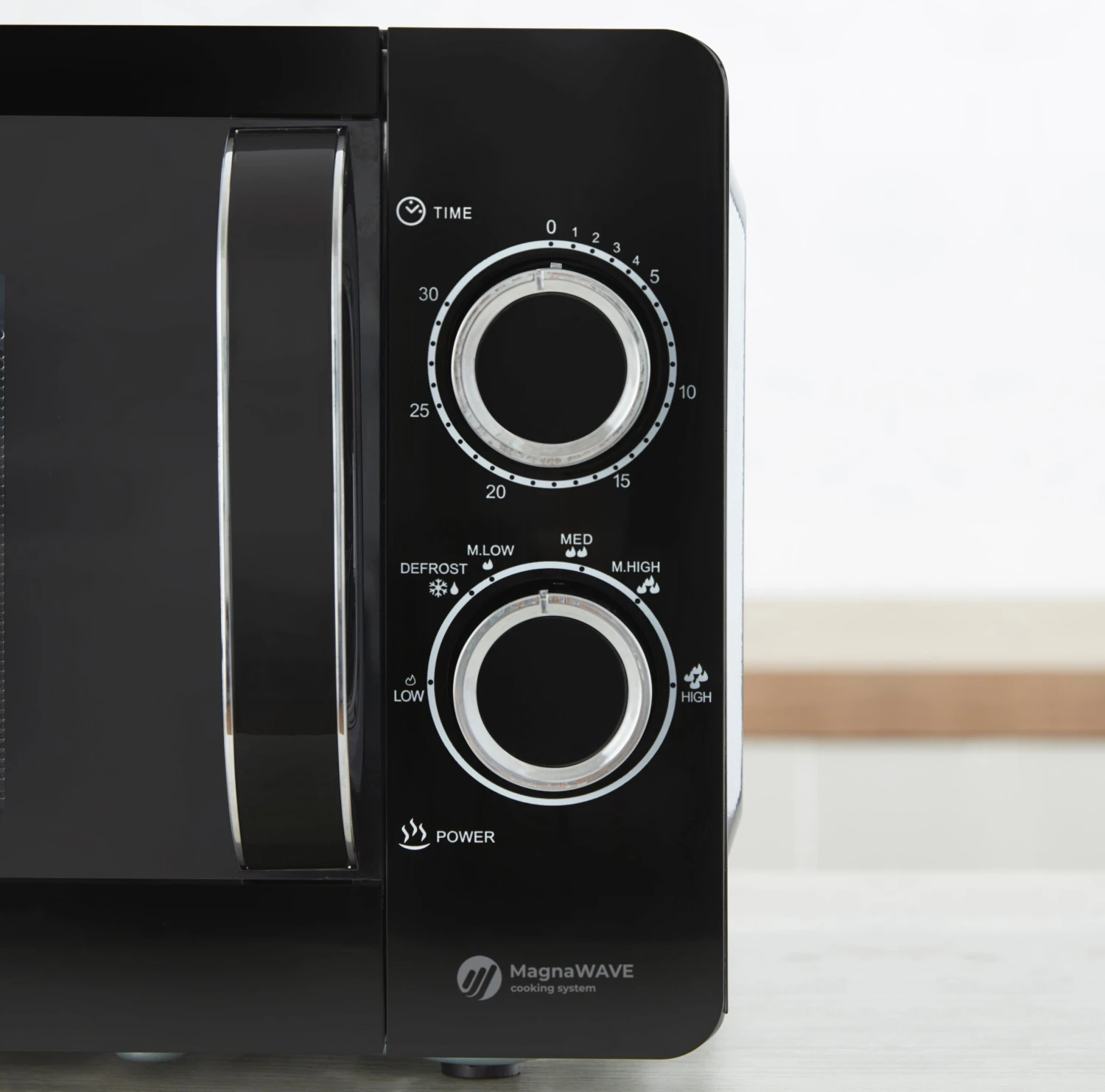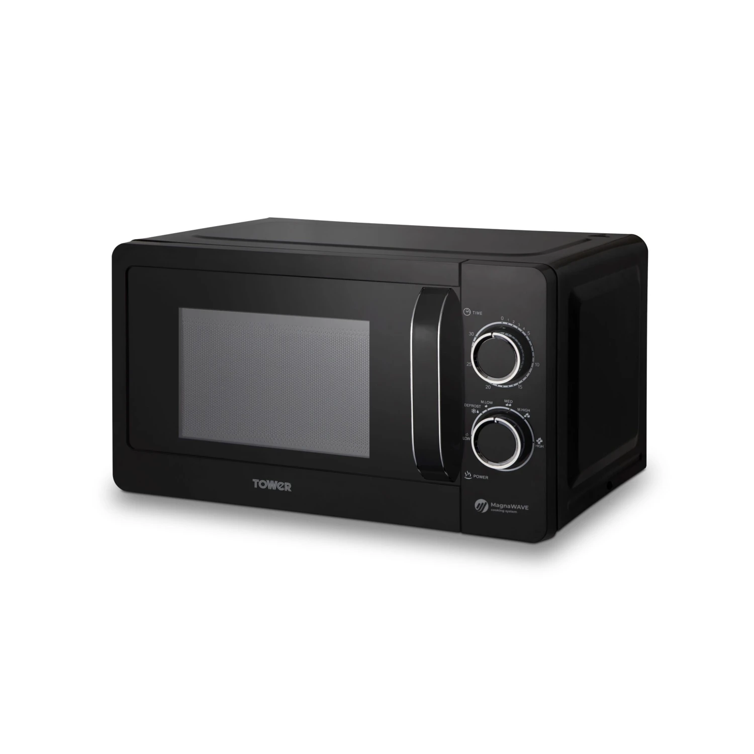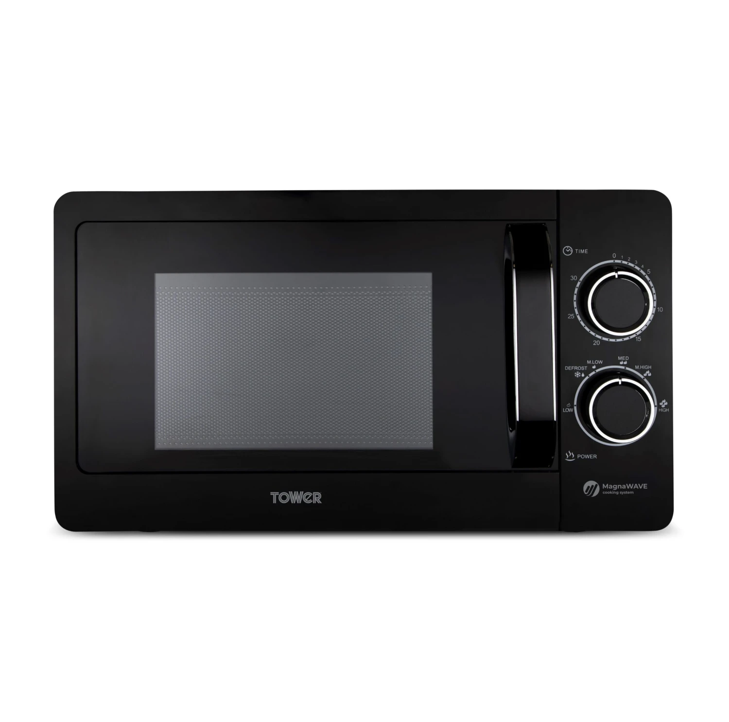 Cook up fuss-free everyday meals for the whole family with the 20L Manual Microwave from Tower. Powered by MagnaWave technology, concentrated waves circulate to ensure heat is distributed evenly for a well cooked meal – keeping intense flavours for amazing results with every use. This microwave features a powerful 800W output for faster cooking and heating, with 6 heat settings that can be adjusted to suit your needs. The huge inner 20 litre capacity can easily fit a standard 10” dinner plate, giving you versatility to use large dishes to cook for the whole family. Its 30-minute timer provides enough time to cook your meals with complete precision so they’re ready to serve, whilst the defrost function cooks meals from frozen in minutes – ideal for leftovers or a speedy emergency snack. The intelligent control panel features large buttons and dial control to use the pre-set functions, defrost settings & manual selections, with a stay cool ergonomic handle for easy open and closing. A high quality glass turntable ensures your food is cooked thoroughly with delicious results, while its sleek mirror door looks great in modern kitchens. The easy to clean interior requires a simple wipe clean after use, to keep your cooking space hygienic and free of any leftover food.