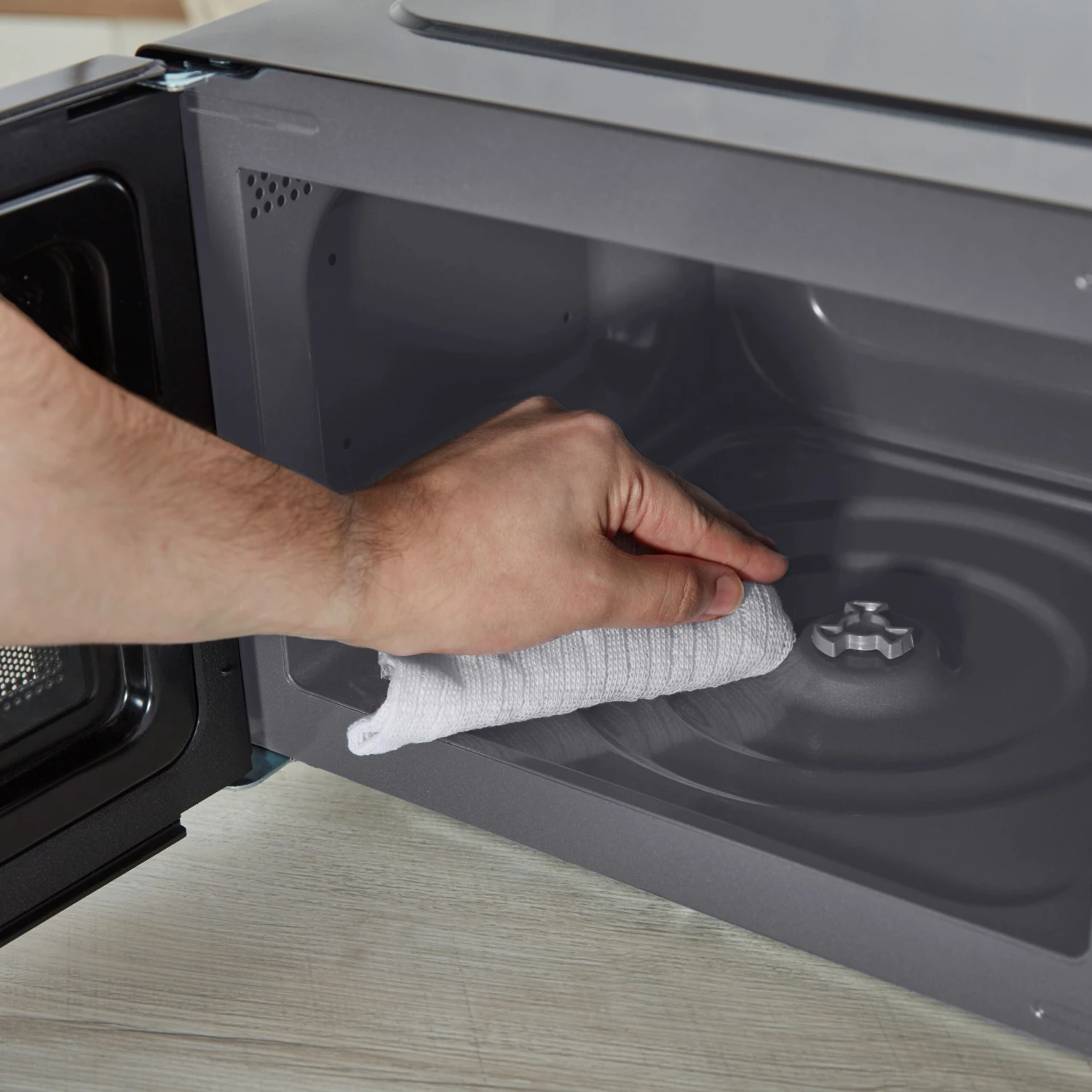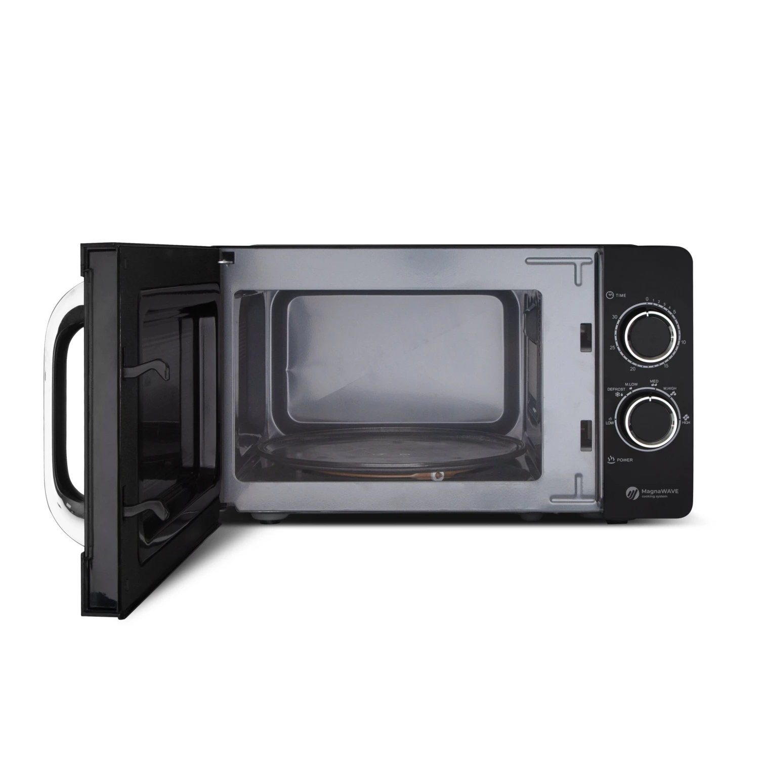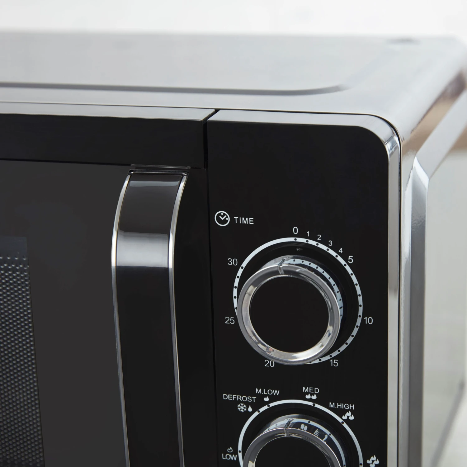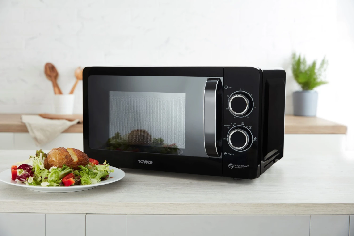 Cook up fuss-free everyday meals for the whole family with the 20L Manual Microwave from Tower. Powered by MagnaWave technology, concentrated waves circulate to ensure heat is distributed evenly for a well cooked meal – keeping intense flavours for amazing results with every use. This microwave features a powerful 800W output for faster cooking and heating, with 6 heat settings that can be adjusted to suit your needs. The huge inner 20 litre capacity can easily fit a standard 10” dinner plate, giving you versatility to use large dishes to cook for the whole family. Its 30-minute timer provides enough time to cook your meals with complete precision so they’re ready to serve, whilst the defrost function cooks meals from frozen in minutes – ideal for leftovers or a speedy emergency snack. The intelligent control panel features large buttons and dial control to use the pre-set functions, defrost settings & manual selections, with a stay cool ergonomic handle for easy open and closing. A high quality glass turntable ensures your food is cooked thoroughly with delicious results, while its sleek mirror door looks great in modern kitchens. The easy to clean interior requires a simple wipe clean after use, to keep your cooking space hygienic and free of any leftover food.