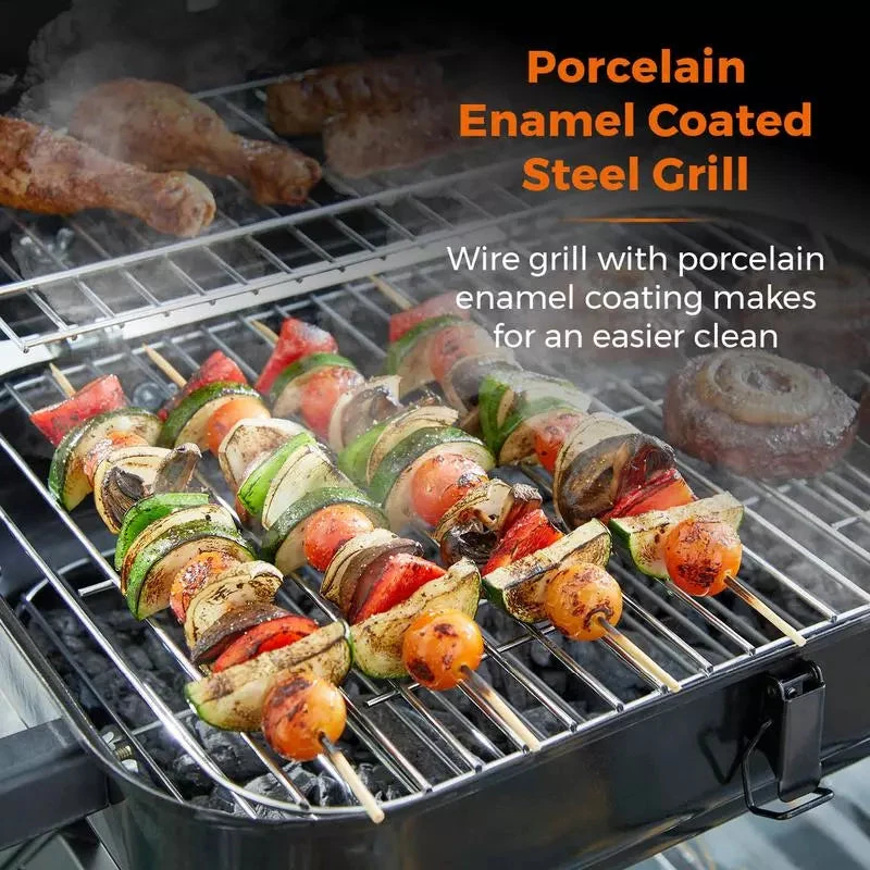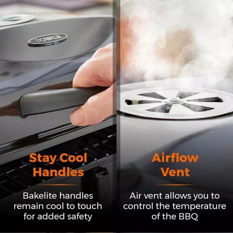 Tower’s Compact Charcoal BBQ is the perfect travel companion wherever you go. Whether it’s a camping holiday or a day trip, you can cook juicy burgers, charred halloumi skewers and succulent steaks anytime, anywhere. You can easily transport the BBQ effortless, simply fold the collapsible legs and use the carry handles for easy portability. Its powder coated steel body is resilient against damage and resistant to warping for continued, long-lasting use. The steel grill plates coated in porcelain enamel are robust and easy to clean, for a seamless and effortless experience from start to finish. Featuring integrated Bakelite carry handles, remaining cool to the touch for added safety, while the airflow vent gives you control over the temperature of the BBQ, allowing you to cook at the perfect temperature.