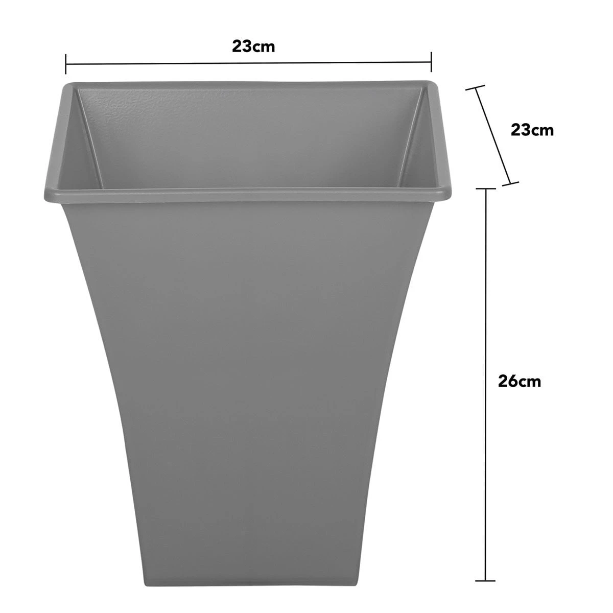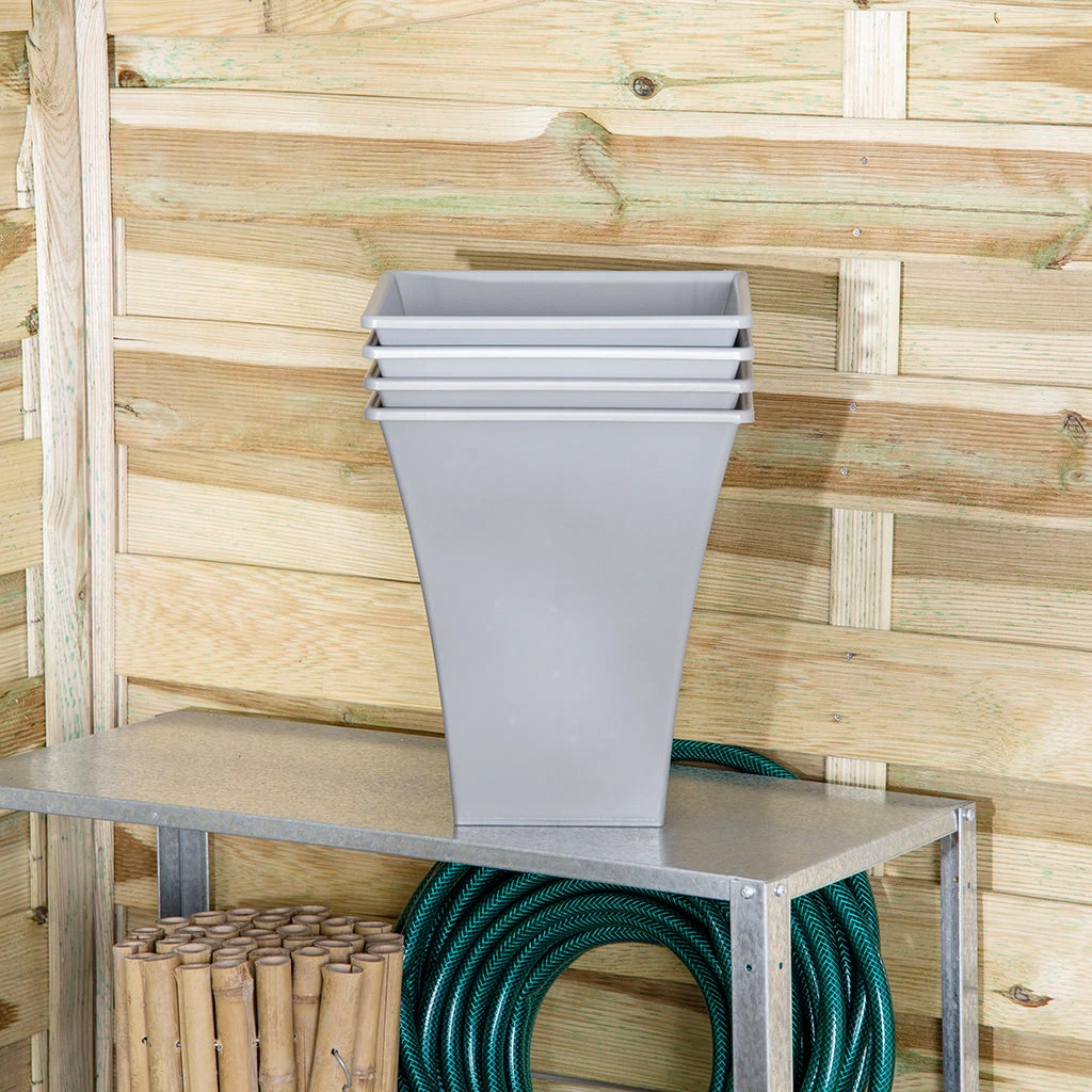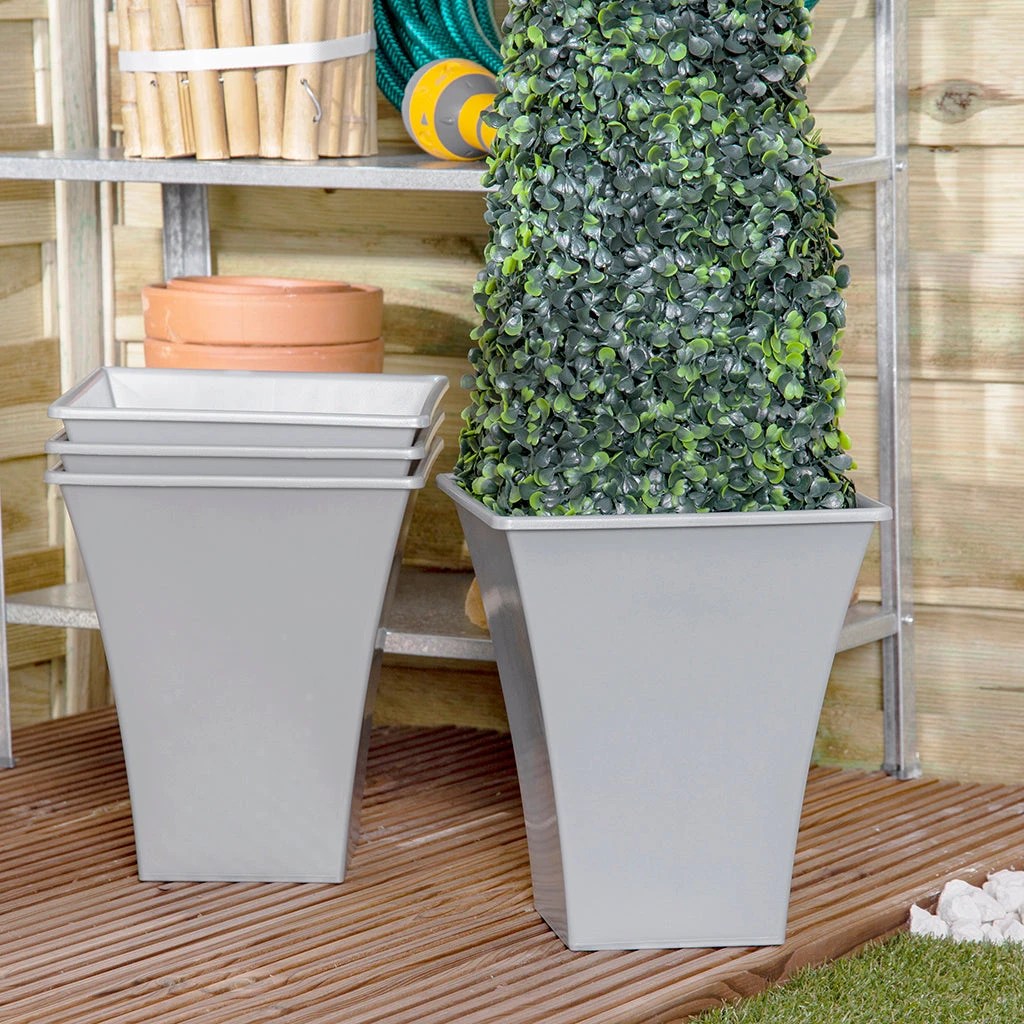 Set of 4 upcycle grey 23cm square Metallica planters suitable for both indoor and outdoor use Weather resistant and lightweight. Made from upcycled material. Dimensions 23x23x26cm