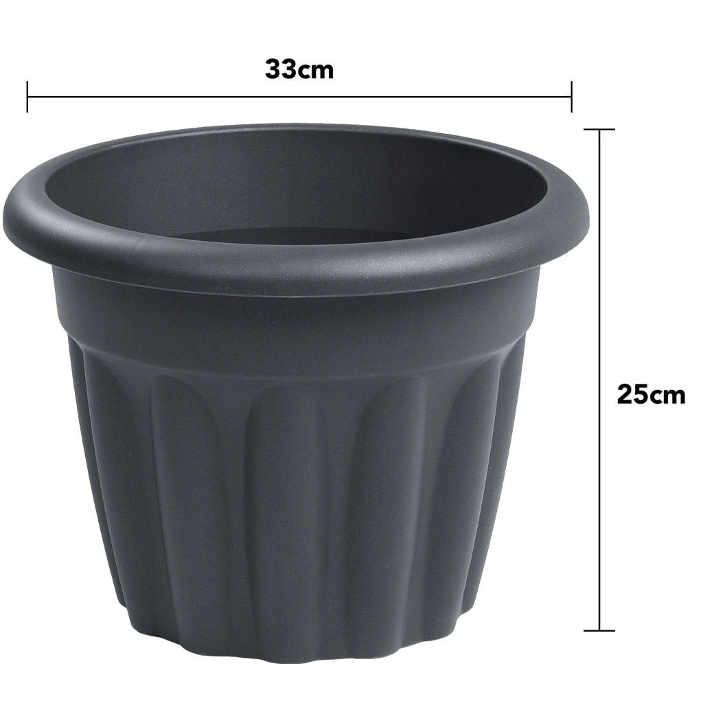 A pack of 3 traditional round planters. This planter is suitable for both indoor and outdoor use being weather resistant and lightweight. Approximately 12 litres capacity. Dimensions:Â 33x33x25cmÂ