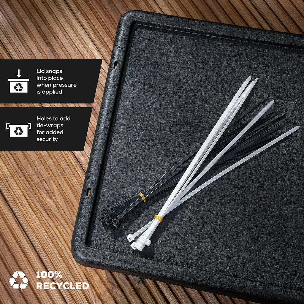Made from recycled plastic. Strong, heavy duty, durable, strength tested storage box. Lid snaps into place and features holes to add tie-wraps for added security. Dimensions:Â 69x49x37cm