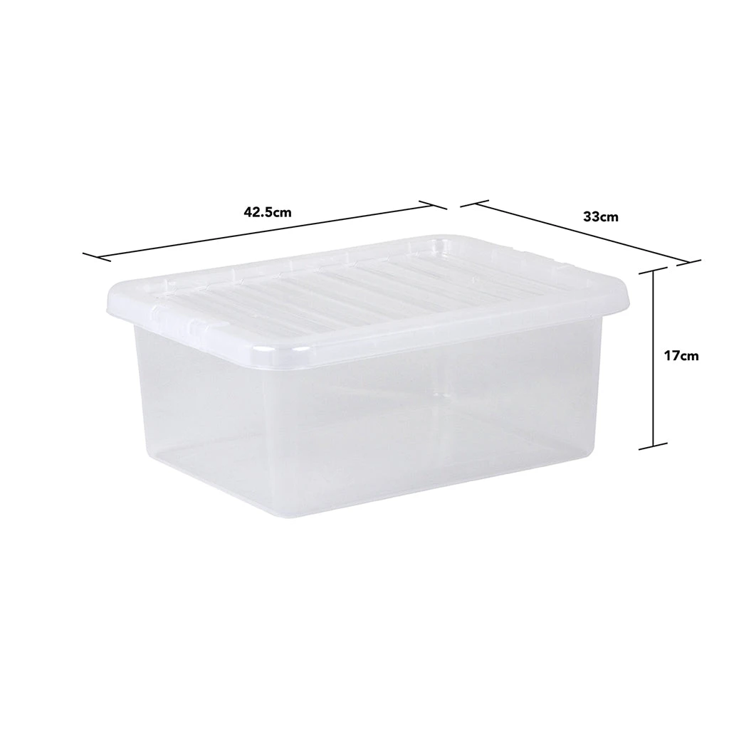 Versatile storage suitable for all around the home and workplace. Curved sides design allows the boxes to stack & store without lids. Boxes are stackable and will nest. Set of 5 clear storage boxes.
