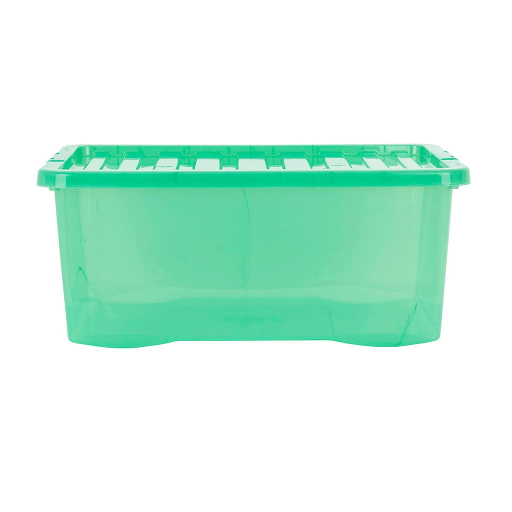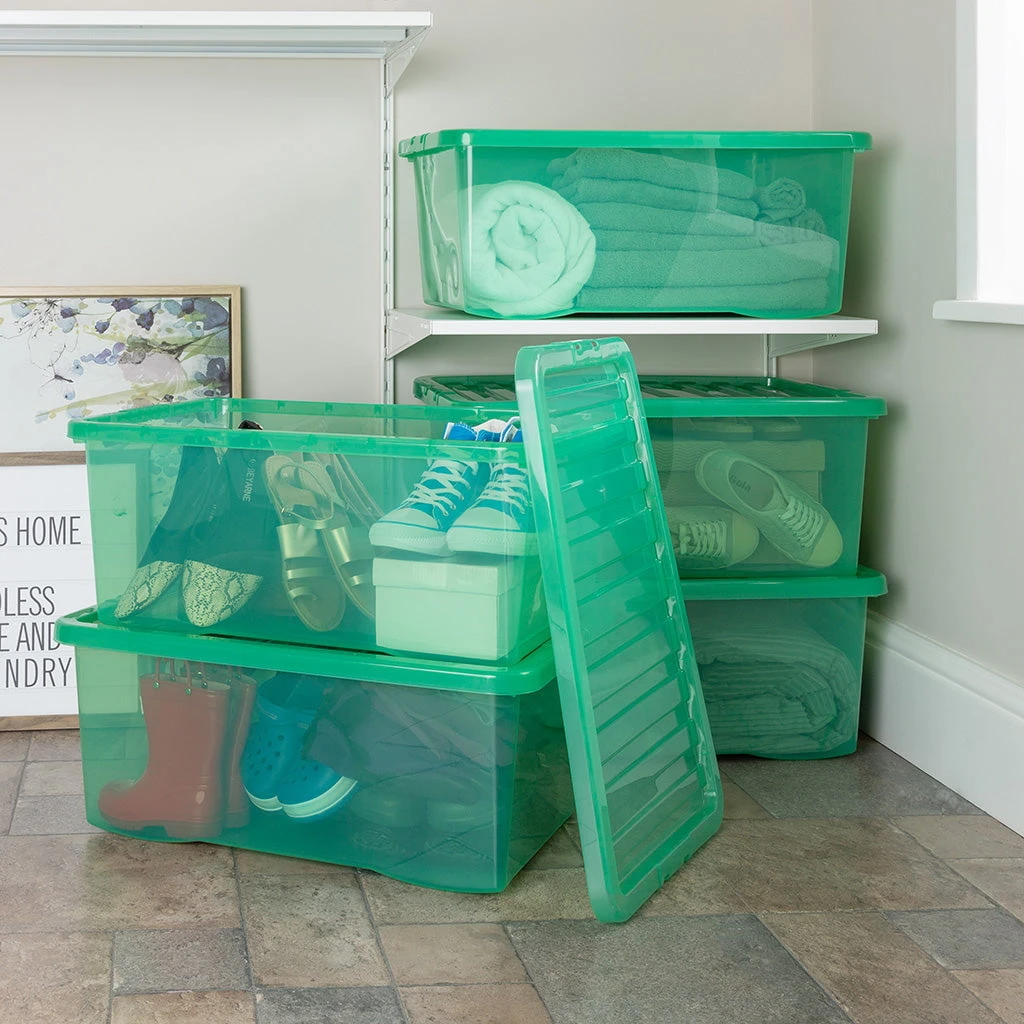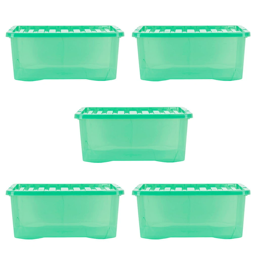 Versatile storage suitable for all around the home and workplace. Curved sides design allows the boxes to stack & store without lids. Boxes are stackable and will nest. Set of 5 tinted green storage boxes.