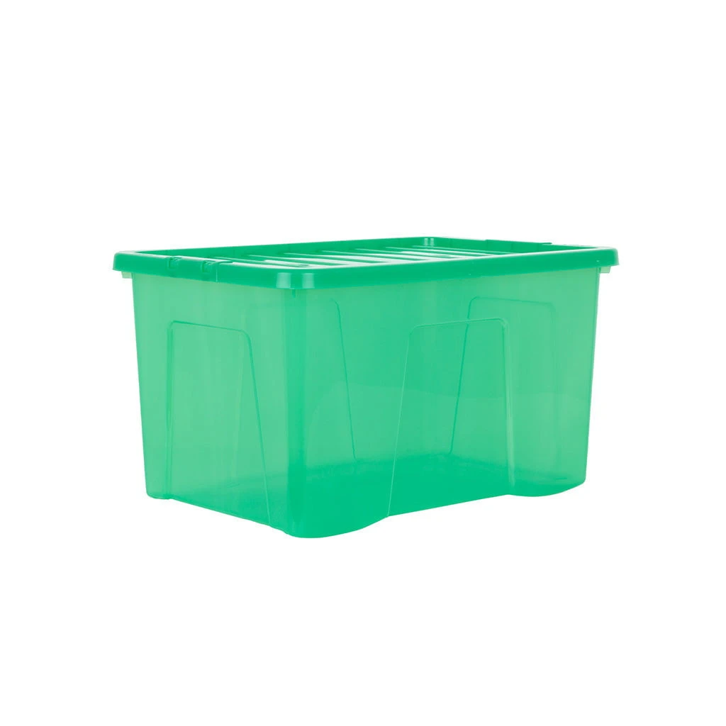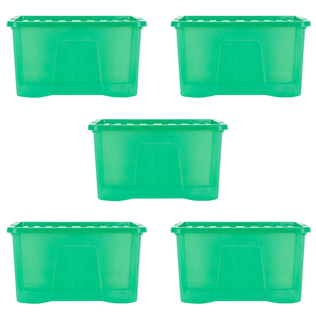 Versatile storage suitable for all around the home and workplace. Curved sides design allows the boxes to stack & store without lids. Boxes are stackable and will nest. Set of 5 tinted green storage boxes.
