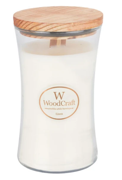 Find tranquility with this Woodcraft Candle Jar, designed with a wooden wick that crackles while burning like an open fire. The glass jar is shaped like an hourglass and comes with a wooden lid to complete the calming and stylish appearance.